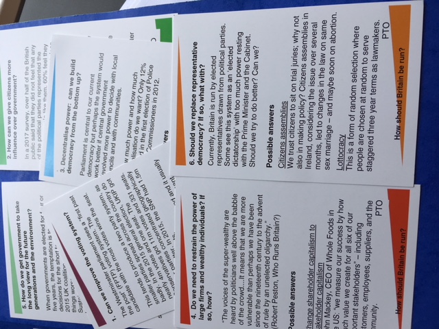 Talk Shop provides facilitators – or will train yours – and a set of information cards. Appealingly written and designed, the cards set out some key issues for discussion and in each case include suggestions for reforms of the system. This kit is designed for you to run a stimulating discussion in a small group of 4-6 people (or multiples of 4-6 up to 36) in a couple of hours. The venue can be your front room, or for larger groups, maybe a room in a library or community centre.